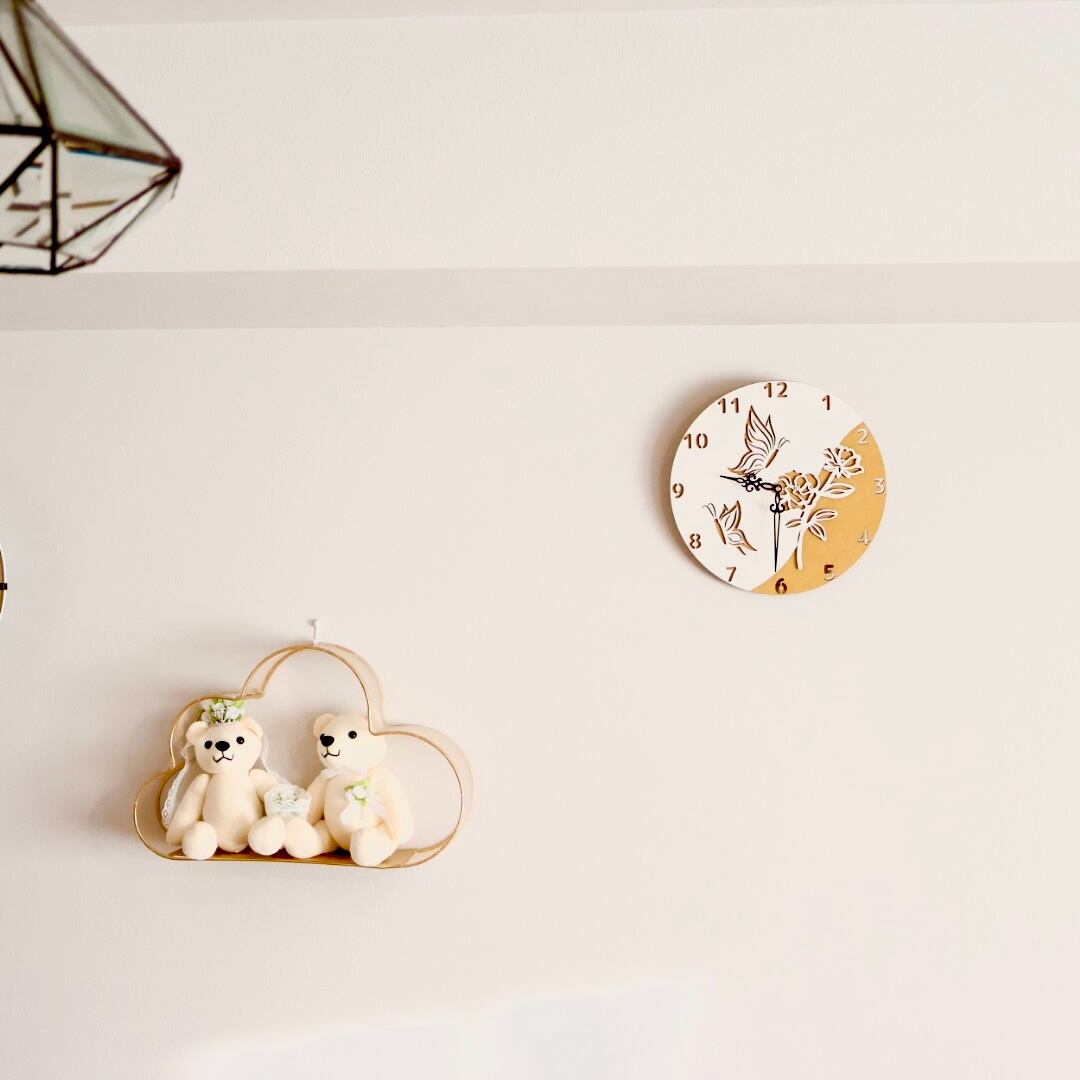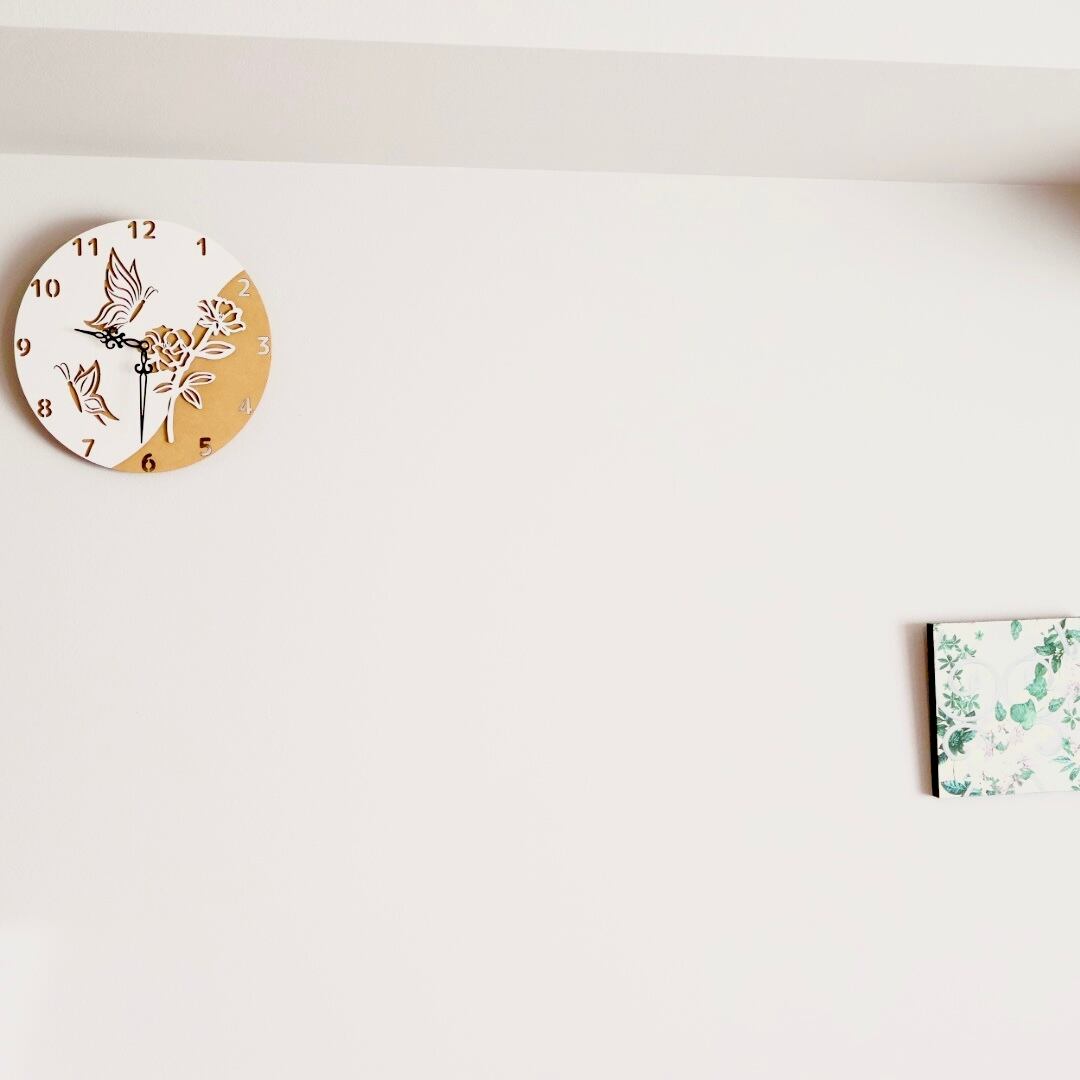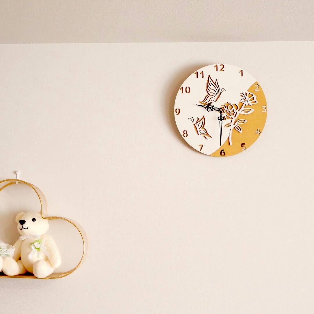 晴れやかな日にお花に舞う蝶を撮影したような景色をイメージした、見るたびにふんわりと心がほどける掛け時計です。