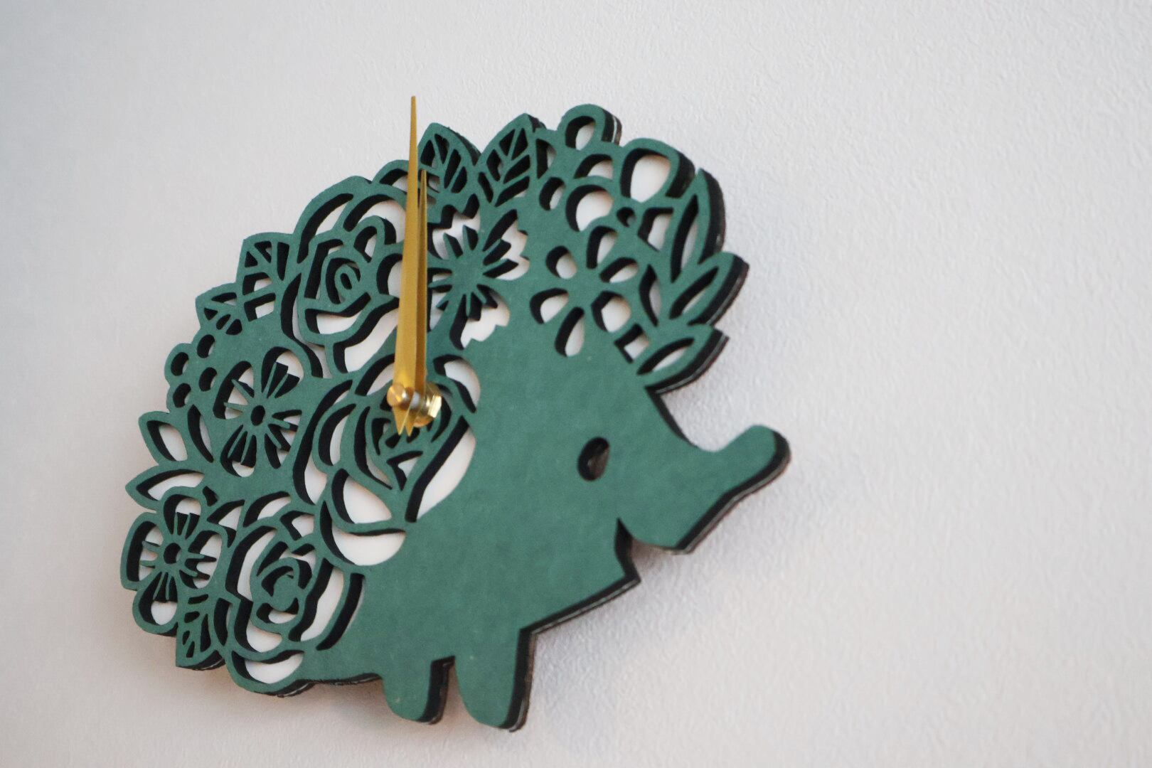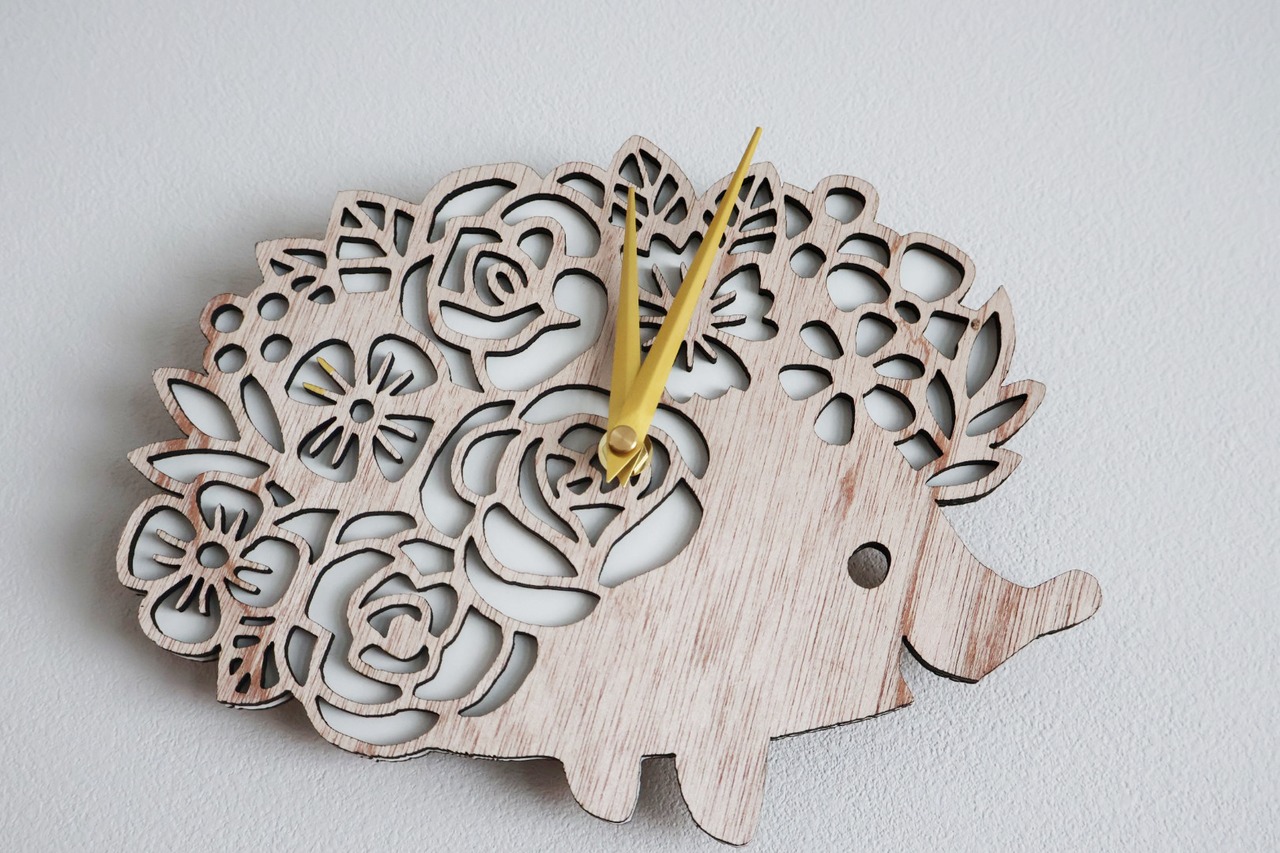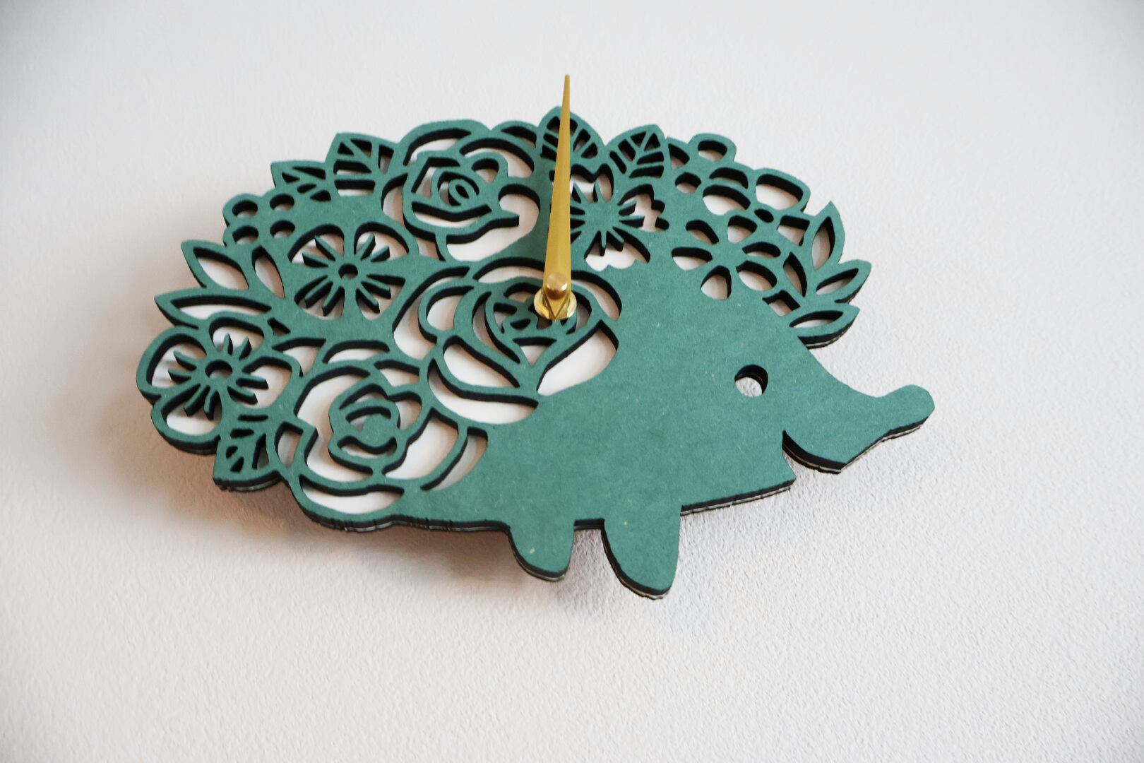 ハリネズミのハリがお花になっている、笑顔を誘うかわいらしいデザインの木製時計です。