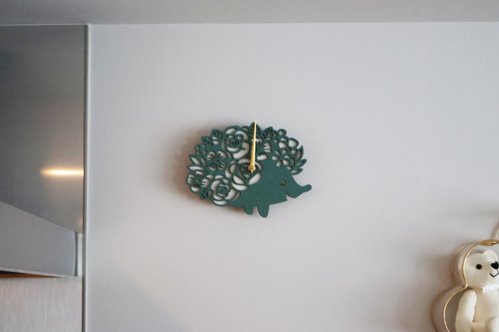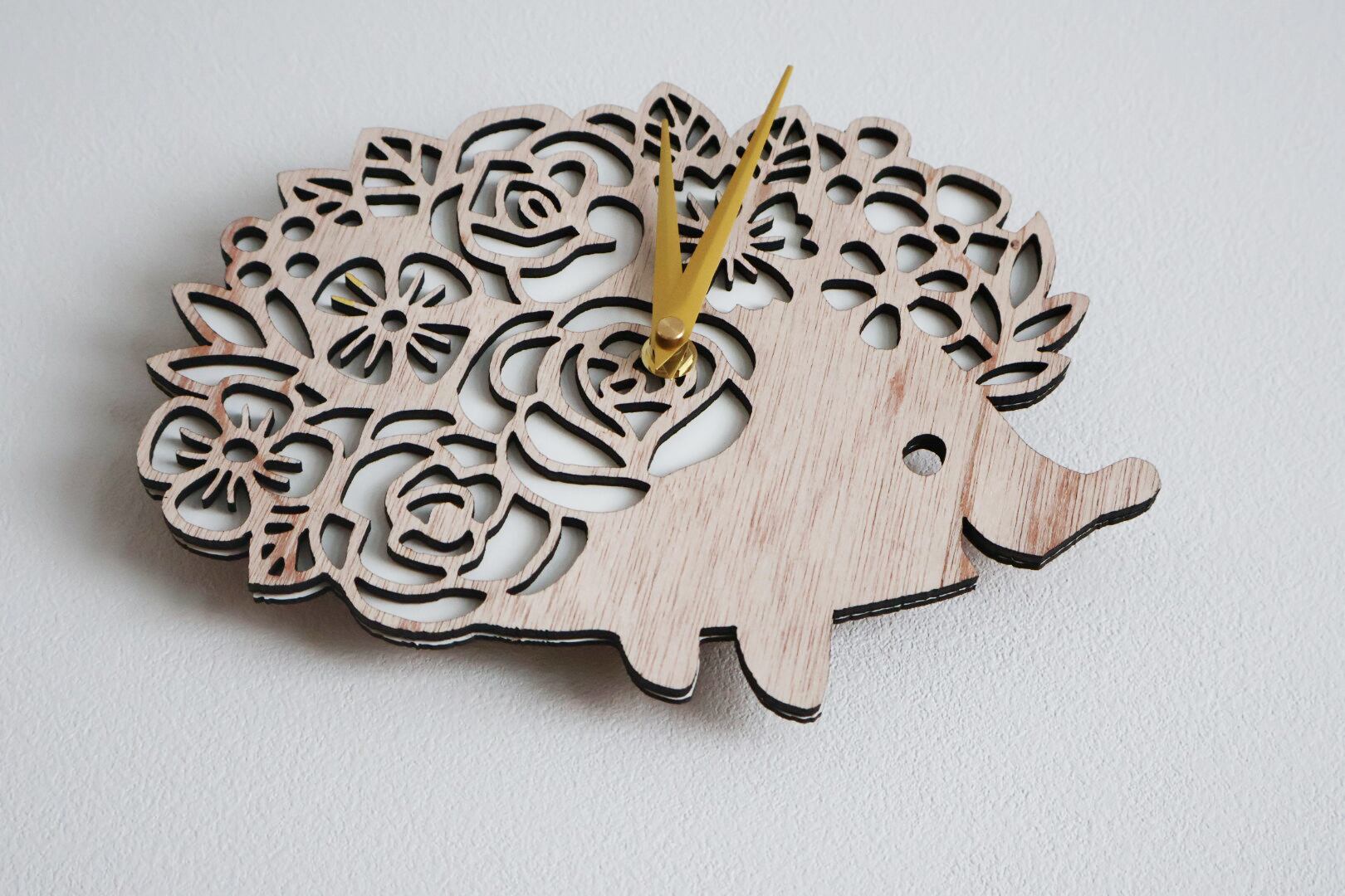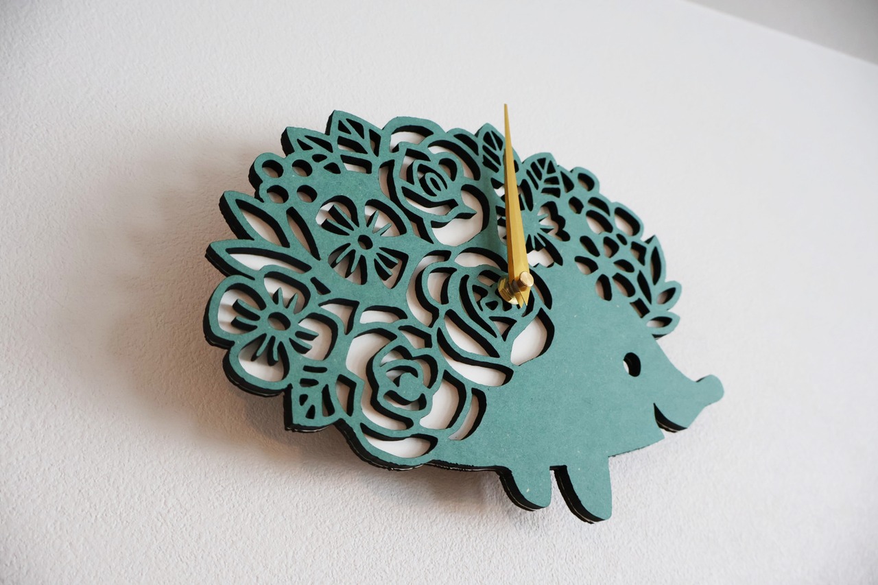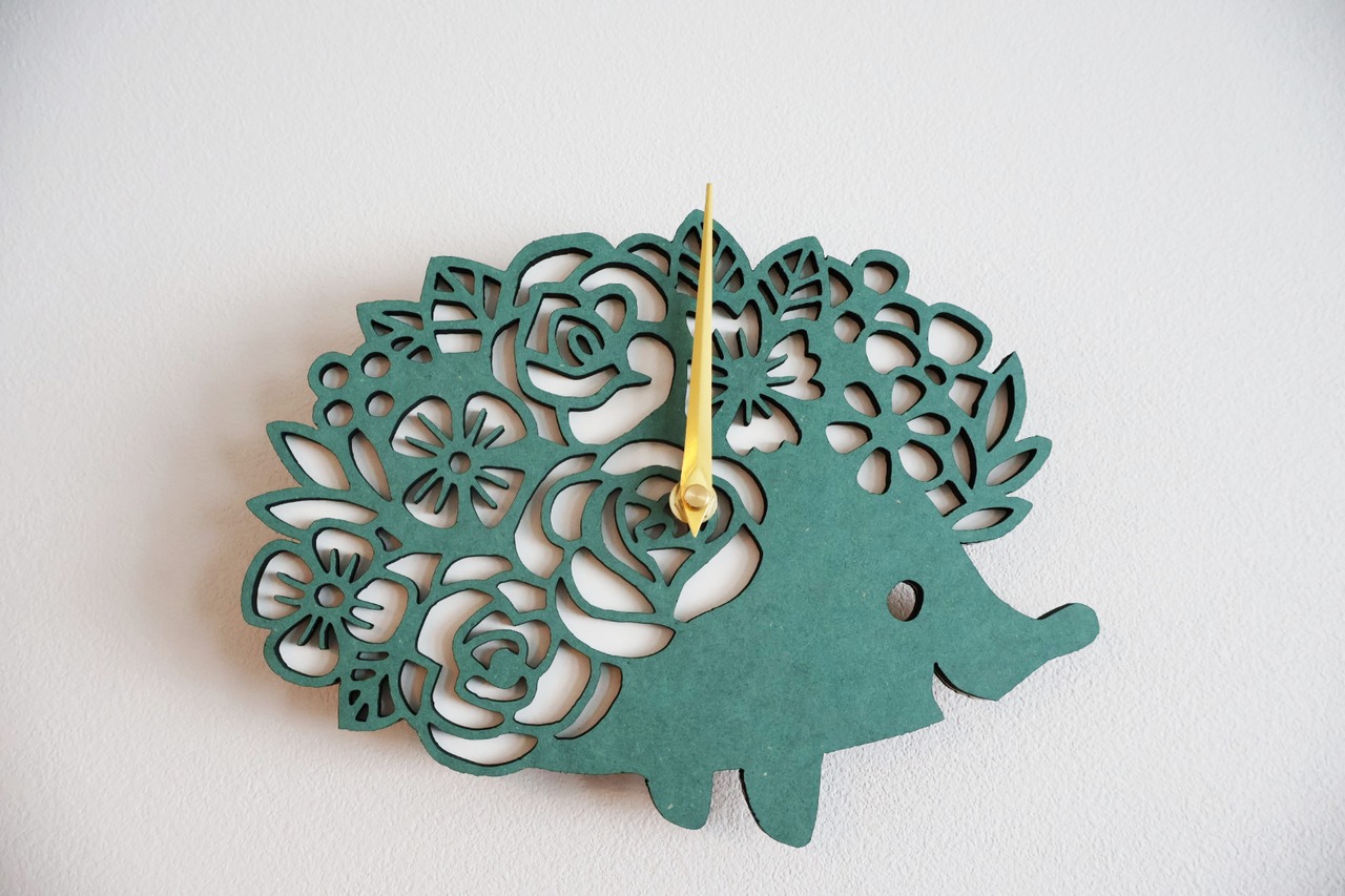 ハリネズミのハリがお花になっている、笑顔を誘うかわいらしいデザインの木製時計です。